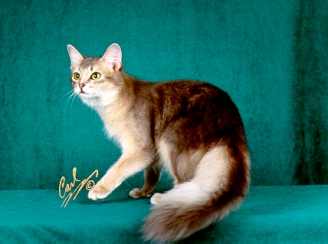 The Somali is a well-proportioned, medium to large cat with firm muscular development, lithe body, showing an alert, lively interest in all surroundings. Somali coats are generally two to three inches in length, non-matting, and easy to care for. They have a remarkable "fox-like" appearance due to their markings, bushy tail, full breeches, and ruff. The Somali is available in ruddy, red, blue, and fawn.